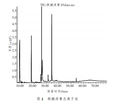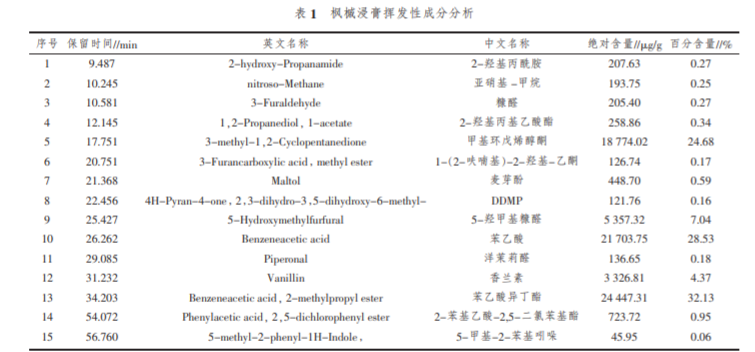 楓槭別名雞爪楓、槭樹,為槭樹科槭樹屬,主要 生長在美國和加拿大等美洲國家, 在中國長江流域 也有分布。 采用一定濃度的乙醇萃取楓槭樹皮等部 位,將溶劑去除獲得楓槭浸膏,楓槭浸膏為深褐色膏 體,具有強(qiáng)烈的焦糖香氣,可以用作食品添加劑以增 加烘烤、焦甜香。作為煙用香料,能夠提高煙香、矯正 卷煙吸味,增加卷煙自然清甜,改善卷煙余味,改善 干、澀、苦的口感 。 對楓槭浸膏揮發(fā)性成分有關(guān)報(bào) 道較少,蘇東贏將楓槭浸膏在不同溫度下進(jìn)行熱 裂解,因?yàn)樵诹呀膺^程中會(huì)發(fā)生熱解、加成等復(fù)雜的 化學(xué)反應(yīng),沒 有對楓槭浸 膏揮 發(fā) 性 成 分 進(jìn) 行 分析,不能表征楓槭浸膏的化學(xué)成分。通過對楓槭浸膏 揮發(fā)性成分進(jìn)行鑒定, 旨在明確楓槭浸膏揮發(fā)性成 分種類及含量, 以期為楓槭浸膏合理使用提供數(shù)據(jù)支撐。
