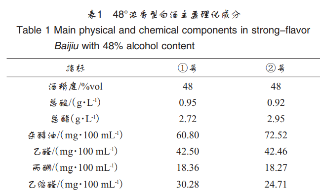 同品牌不同勾調(diào)工藝的48°濃香型白酒(編號(hào)分別為 ①號(hào)、②號(hào)),主要理化成分見表1,由四川省綿陽(yáng)市豐谷酒 業(yè)有限公司提供。