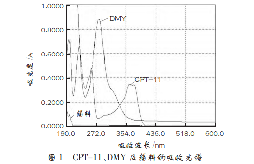 用 甲 醇 配 制 CPT-11、 DMY 和輔料(空白脂質(zhì)體)等溶液,使用紫外分光 光度計(jì)在 190~600nm 處進(jìn)行波長(zhǎng)掃描,掃描結(jié)果見(jiàn)圖1。