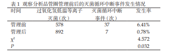 過氧化氫低溫等離子滅菌,屬于新型滅菌技術(shù),不僅環(huán) 保、安全,而且低溫、快速,應用范圍廣,常常用于腔鏡器械、 微創(chuàng)手術(shù)器械與導管的滅菌處理,如關(guān)節(jié)鏡、宮腔鏡、腹腔 鏡、導航器材、光纖等。過氧化氫低溫等離子滅菌,要求每一 環(huán)節(jié)達到質(zhì)量標準,滅菌效果才合格。調(diào)查發(fā)現(xiàn),消毒供應室 的工作人員對過氧化氫低溫等離子滅菌認識程度不深,雖然 了解一些關(guān)于滅菌方法、滅菌物品及過氧化氫濃度等方面的 知識,但掌握不夠全面,滅菌質(zhì)量控制相對模糊,滅菌循環(huán)中 斷事件頻頻發(fā)生。本次研究發(fā)現(xiàn),品管圈實施后滅菌循環(huán)中 斷率為0.78%,明顯低于品管圈實施前的6.41%(P<0.05)。由此 可見,運用品管圈活動進行質(zhì)量管理,可降低過氧化氫低溫等 離子滅菌循環(huán)中斷率,值得在臨床推廣應用。