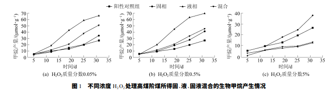 2) 研究結(jié)果表明,液相產(chǎn)物單獨(dú)降解的甲烷產(chǎn) 量最大,高煤階煤可達(dá) 68 μmol /g,增產(chǎn) 161%; 中煤 階煤可達(dá) 57 μmol /g,增產(chǎn) 338%。高階殘煤降解產(chǎn) 甲烷量隨 H2O2濃度的增大而增大,5%H2O2 處理?xiàng)l 件下的甲烷產(chǎn)量為 38 μmol /g,相比對(duì)照組提高了 46%,增產(chǎn)效果突出。