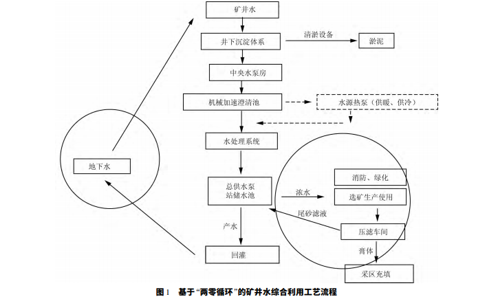 為了解決中關(guān)鐵礦礦井水綜合利用的問題,針 對礦井水產(chǎn)生過程、排放流程和整個(gè)生產(chǎn)系統(tǒng)的工藝特點(diǎn),對各個(gè)用水環(huán)節(jié)均進(jìn)行了詳細(xì)梳理,提出了 礦井水“兩零循環(huán)”綜合利用模式。“兩零循環(huán)”中 的第一個(gè)“零”是指地下水通過巖石裂隙進(jìn)入采區(qū) 形成礦井水,經(jīng)過井下排泥系統(tǒng)梯級沉淀除去固體 雜質(zhì),經(jīng)過中央水泵房集中排出地表,在地表經(jīng)過3# 機(jī)械加速澄清池進(jìn)一步凈化,經(jīng)過水源熱泵提取水 中蘊(yùn)含的低品位熱量,然后進(jìn)入水處理系統(tǒng),轉(zhuǎn)變?yōu)槿愃畼?biāo)準(zhǔn)后經(jīng)過管道全部回灌入地下,達(dá)到礦井 水來自地下含水層又回到地下含水層的目的,從而 實(shí)現(xiàn)礦井 水 的 零 排 放。“兩零 循 環(huán)”中 的 第 二 個(gè) “零”是指生產(chǎn)用水經(jīng)過總供水泵站的環(huán)水泵、加壓 泵進(jìn)入選礦系統(tǒng),作為生產(chǎn)用水在選廠參與一系列 選礦作業(yè),形成攜帶礦砂的礦漿水,攜帶尾砂進(jìn)入壓 濾車間,經(jīng)過壓濾設(shè)備實(shí)現(xiàn)泥水分離,最后濾液經(jīng)過 管道泵再次回到總供水泵站,從而實(shí)現(xiàn)生產(chǎn)用水的 閉環(huán)循環(huán),同時(shí)生活用水也經(jīng)過類似的過程實(shí)現(xiàn)相 應(yīng)的閉環(huán)循環(huán),實(shí)現(xiàn)生產(chǎn)生活廢水的零排放。優(yōu)化 后的中關(guān)鐵礦基于“兩零循環(huán)”的礦井水綜合利用 工藝流程如圖 1 所示。
