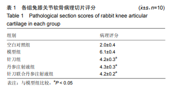 實驗選用新西蘭白兔50只,分為 5組,實驗過程無脫失,全部進入結(jié)果分析??瞻讓φ战M膝關(guān)節(jié)軟骨無明顯 磨損, 周圍滑膜無明顯增生及炎性改變。模型組液組膝關(guān) 節(jié)磨損較為嚴重,軟骨破壞達到3級,但并未暴露軟骨下骨, 周圍滑膜增生及炎性改變較為明顯。針刀組、丹參注射液 組、針刀聯(lián)合丹參注射液組膝關(guān)節(jié)輕度磨損,1級到2級, 周圍滑膜增生及炎性改變不明顯,兩組在大體觀下無法辨 別磨損嚴重程度的差異??瞻讓φ战M 軟骨表明光滑、軟骨細胞梭形排列,形態(tài)、數(shù)目、結(jié)構(gòu)基 本正常,無血管翳生成;模型組表層軟骨細胞明顯減少, 細胞排列紊亂;針刀組軟骨表層較為光滑、軟骨細胞數(shù)目 結(jié)構(gòu)基本正常;丹參注射液組軟骨表層光滑、軟骨細胞排 列輕度紊亂,局部缺損;針刀聯(lián)合丹參注射液組軟骨表層 較為光滑,軟骨細胞數(shù)量結(jié)構(gòu)基本正常。見圖1。病理切片 評分,丹參注射液組評分略高于針刀組和針刀聯(lián)合丹參注 射液組,但此3組之間差異無顯著性意義。見表1。