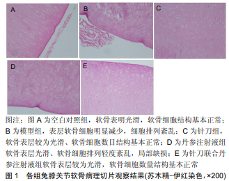 將50只健康新西蘭白兔隨機 分為5組進行實驗:空白對照組、模型組、單純丹參注射液 組、單純閉合針刀松解組(針刀組)、閉合針刀松解結(jié)合丹參 注射液組關(guān)節(jié)腔注射組(針刀聯(lián)合丹參注射液組),每組各10 只。所有動物同等條件下飼養(yǎng)1周,穩(wěn)定后,除空白對照組 外其他4組兔均參考張子峰等報道的方法造模:將兔取左 側(cè)臥位,于右側(cè)髖關(guān)節(jié)大轉(zhuǎn)子后約1 cm處為中點,上下直切 口3 cm,分離髂內(nèi)靜脈屬支臀下靜脈,雙重結(jié)扎,結(jié)扎線 間切斷。仰臥位,右側(cè)腹股溝觸及動脈搏動處作1 cm縱形切 口,分別分離股靜脈、大隱靜脈,分別雙重結(jié)扎后于結(jié)扎線 間切斷。于右側(cè)膝關(guān)節(jié)間隙水平切斷腓腸肌內(nèi)、外側(cè)頭,切 除5 mm長一段跟腱。所有手術(shù)切口縫合皮下組織、皮膚后 敷蓋乙醇紗布、棉墊。造模后連續(xù)3 d注射青霉素5 U/(kg•d)、 鏈霉素10×104 U/(kg•d),所有動物分籠飼養(yǎng)。造模后每日驅(qū) 趕動物活動2 h,共驅(qū)趕動物2周,2周后動物出現(xiàn)關(guān)節(jié)僵硬、 瘸行,關(guān)節(jié)周圍可觸及條索結(jié)節(jié),X射線片顯示下肢力線 右外翻10°變?yōu)閮?nèi)翻,提示造模成功。