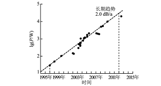 1993年,HongPo等人研制出摻釹雙包層光纖 激光 器。2002 年,J.Limpert 等 人 研 制 出 鉺 鐿 (Er3+/Yb3+ )共摻的雙包層光纖激光器,實(shí)現(xiàn)了150 W 的單模連續(xù)激光功率輸出,大大推動(dòng)了高功率摻 鐿光纖激光器的開發(fā)。2009年,光纖激光器的全球 領(lǐng)跑者IPG 公司基于同帶泵浦技術(shù)使用1.018μm 的激 光 作 為 泵 浦 光,首 次 實(shí) 現(xiàn) 了 單 纖 單 模 輸 出 10 kW,光束 質(zhì) 量 因 子 M2 <1.31。2012年,IPG 公 司的單纖單模功率達(dá)到了20kW。截至2019年 1月,IPG 公司 的 光 纖 激 光 器 最 高 輸 出 水 平 為 單 模 20kW 與多模500kW。圖1示出了國(guó)外光纖激光 器單纖單模激光功率P 的提升情況,可以看出從 1997年至2012年,光 纖激光器的單纖單模輸出功 率水平的提升大致為2.0dB/a,約合1.58倍/a。
