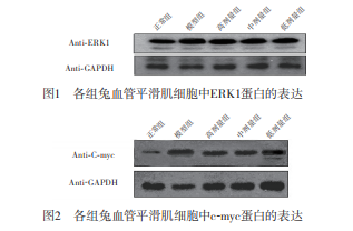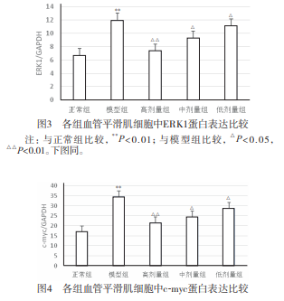 應用SPSS 17.0軟件進行統(tǒng)計分析,組間資 料應用單因素方差分析。以P<0.05為差異有統(tǒng)計學意義。 結果 見圖1-圖4。結果顯示:與正常組比較,模型組ERK1、c-myc 蛋白表達水平顯著升高(P<0.01)。與模型組比較,各用藥組 ERK1、c-myc蛋白表達水平顯著降低(P<0.05,P<0.01)。其中, 高劑量組ERK1、c-myc蛋白表達水平降低最為明顯,低劑量組 變化差異最小。