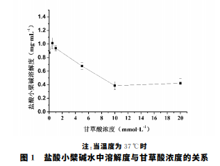 如圖1所示,選用不同濃度甘草酸后,隨著濃度的增加, 鹽酸小檗堿溶解度隨之下降。當甘草酸濃度為10mmol·L-1 時,此時鹽酸小檗堿的溶解度最低,與純水中的溶解度相比, 溶解度下降了2.3倍。繼續(xù)加大甘草酸的濃度后,鹽酸小檗 堿的溶解度變化不明顯。