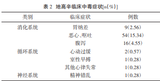本次研究結(jié)果由表 2 可知, 發(fā)生地高辛中毒癥狀以消化道癥狀為主,共有 79 例(22.45%)。臨 床上該癥狀易與消化系統(tǒng)疾病混淆,延誤治療時機,臨床藥師應(yīng) 對以上兩種情況加以區(qū)分,給醫(yī)生提供有效建議。