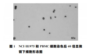 為確定經(jīng)免疫化學(xué)染色鑒定后的腫瘤細胞形態(tài) 特征,我們先 對 NCI-H1975肺癌 細 胞 系、正 常 人 外 周血單核細胞 PBMC進行了染色鑒定,染色后腫瘤 細胞呈現(xiàn)典型的紅色,PBMC 染色后呈現(xiàn)典型的藍 黑色,形態(tài)特征見下圖1。