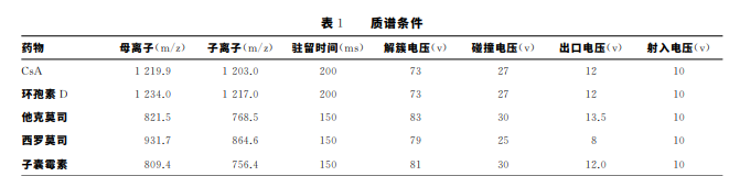 色譜條件:采用 UltimateXB- C18色譜柱(4.6mm×50mm,5μm),柱溫65 ℃;流 速:0.8mL/min;流動相:2mmoL/L 乙酸銨-0.1%甲 酸水溶液(B)-0.1%甲酸甲醇溶液(A),進樣量5μL; 洗脫方式:梯度洗脫,其中0.01~0.1minA 相水平從 50%~100%,保持0.9min,1.0~1.1minA 相水平從 100%~50%,保持1.9 min。質(zhì)譜 條 件:電 噴 霧 電 離 源(ESI);離子極性:正離子模式;監(jiān)測模式為 MRM;離 子噴射電壓:5000V;溫度:325 ℃;噴霧氣(GS1):65; 輔助加熱氣(GS2):55;氣簾氣(Curtaingas):20;碰撞氣 壓力:Medium;用于定量分析離子分別為:CsA 質(zhì)荷比 (m/z)1219.900~1203.100,環(huán) 孢 素 D m/z1234. 000~1217.000,他克莫司 m/z821.5~768.5,西羅莫 司 m/z931.7~864.6,子囊霉素 m/z809.4~756.4;各 種質(zhì)譜條件參數(shù)如表1。