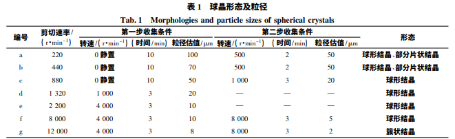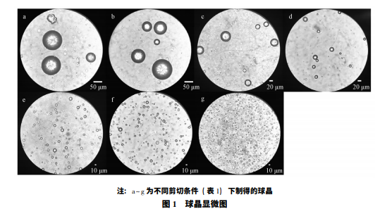 在不同剪切條件下制 備球晶,于顯微鏡下觀察所得產(chǎn)物粒徑及形狀,結 果見表 1、圖 1。由此可知,通過控制工藝條件可 制得粒徑 5 ~ 100 μm 之間的球晶,剪切速率較低 時,生成部分不規(guī)則形狀結晶; 剪切速率過高 ( >10 000 r/min) 時可得到初乳,但在固化過程 中乳 滴 破 裂,未能聚集成球晶,而 是 得 到 簇 狀 結晶。