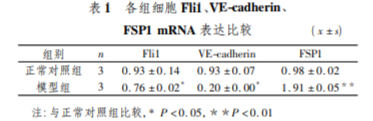 Fli1、VE-cadherin、FSP1 mRNA 表 達(dá)比較 TGF-β1 誘導(dǎo) HUVEC 細(xì)胞后,QPCR 法檢 測(cè) Fli1、VE-cadherin、FSP1 的表達(dá),發(fā)現(xiàn)模型組內(nèi)皮 標(biāo)志物 VE-cadherin 表達(dá)降低( P < 0. 01) ,間質(zhì)標(biāo)志 FSP1 表達(dá)升高( P < 0. 01) ,提示 TGF-β1 誘導(dǎo)內(nèi)皮 間質(zhì)轉(zhuǎn)化模型建模成功; 同時(shí)模型組 Fli1 表達(dá)低于 對(duì)照組( P < 0. 05) 。見(jiàn)表 1。