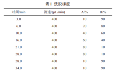 安捷倫Eclipse XDB-C18反相色譜柱 (4.6 mm×150 mm,3.5 µm),柱溫 40℃,流動(dòng)相 A:B=乙 腈(: 水/0.1%甲酸),洗脫梯度見表1,進(jìn)樣體積10 µL。