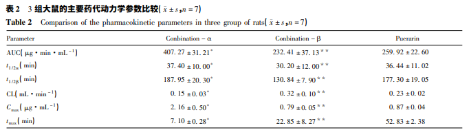 葛根素、聯(lián)合 α 組和聯(lián)合 β 組的大鼠體內藥代動 力學過程均符合兩房室模型。聯(lián)合 α 組與葛根素組 比較,AUC、t1 /2α、t1 /2β和 Cmax均明顯增加,差異均有統(tǒng) 計學意義( 均 P < 0. 05) ; 聯(lián)合 β 組與葛根素組比較, AUC、t1 /2α、t1 /2β和 Cmax均明顯降低,差異均有統(tǒng)計學意 義( 均 P < 0. 05) 。結果見表 2。