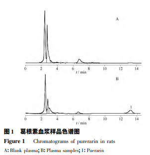 葛根素與內標的保留時間分別為 13. 34 和 5. 91 min,表明血漿中內源性物質不干擾葛根素和內標的 測定。結果見圖 1。